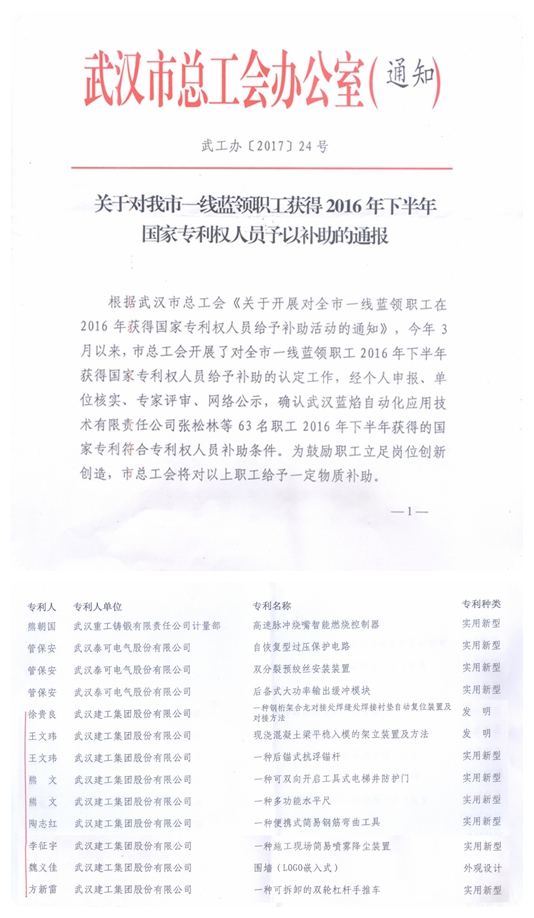 為鼓勵職工立足崗位創(chuàng)新創(chuàng)造,近日武漢市總工會對2016年下半年獲得國家專利權(quán)的一線職工發(fā)放了專利補助。經(jīng)過個人申報、單位核實、專家評審、網(wǎng)絡(luò)公示,全市共確認(rèn)了63名具備補助條件的職工,其中武建集團(tuán)的徐貴良、熊文、王文瑋等7位員工取得的《一種鋼桁架合攏對接處焊縫襯墊自動復(fù)位裝置及對接方法》等9項專利成果入選。